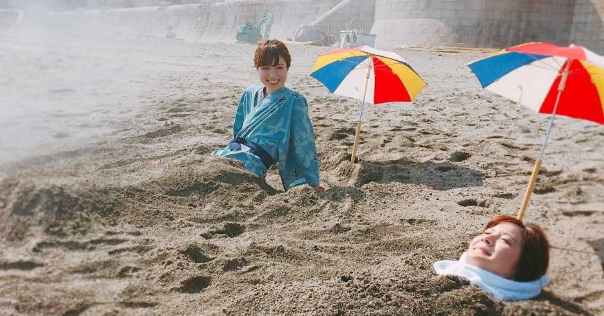ผู้เข้ารับบริการจะถูกฝังตัวลงในทรายร้อนเพื่อขับสารพิษจากร่างกาย ที่มาของภาพ letsgojp.comเทนมงคัง (TENMONKAN)