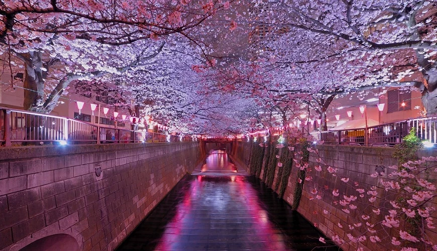 ในฤดูใบไม้ผลิ ต้นซากุระราว 800 ต้นจะบานพร้อมกันตลอดสองฝั่งคลองเมกุโระ เกิดเป็นอุโมงค์ซากุระอันโด่งดังของโตเกียว ในยามค่ำคืนที่มีแสงไฟประดับ ภาพสะท้อนของดอกซากุระบนผิวน้ำจะเกิดเป็นทัศนียภาพอันงดงามที่ดึงดูดทั้งช่างภาพและผู้ชื่นชอบดอกซากุระให้มาชื่นชม